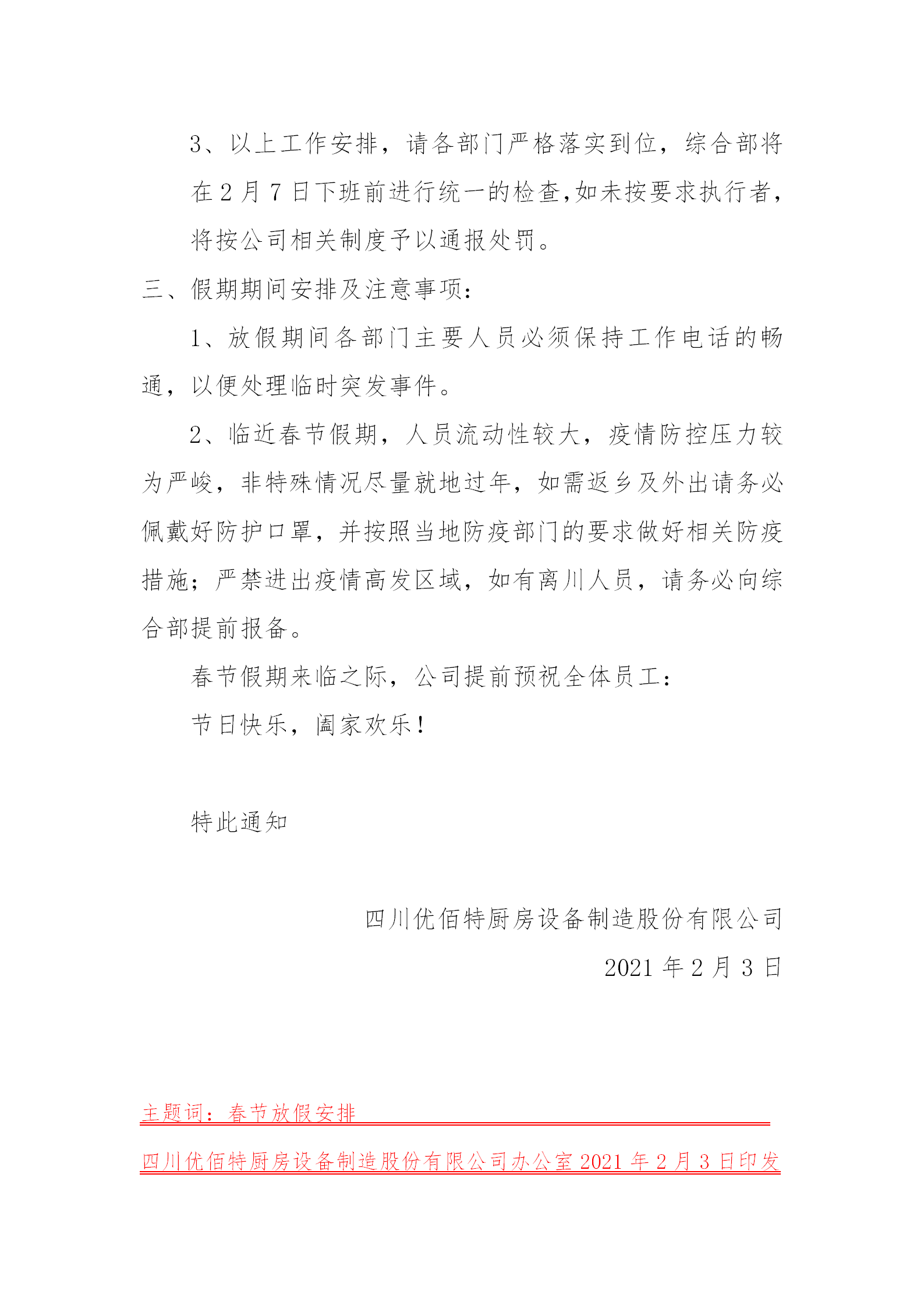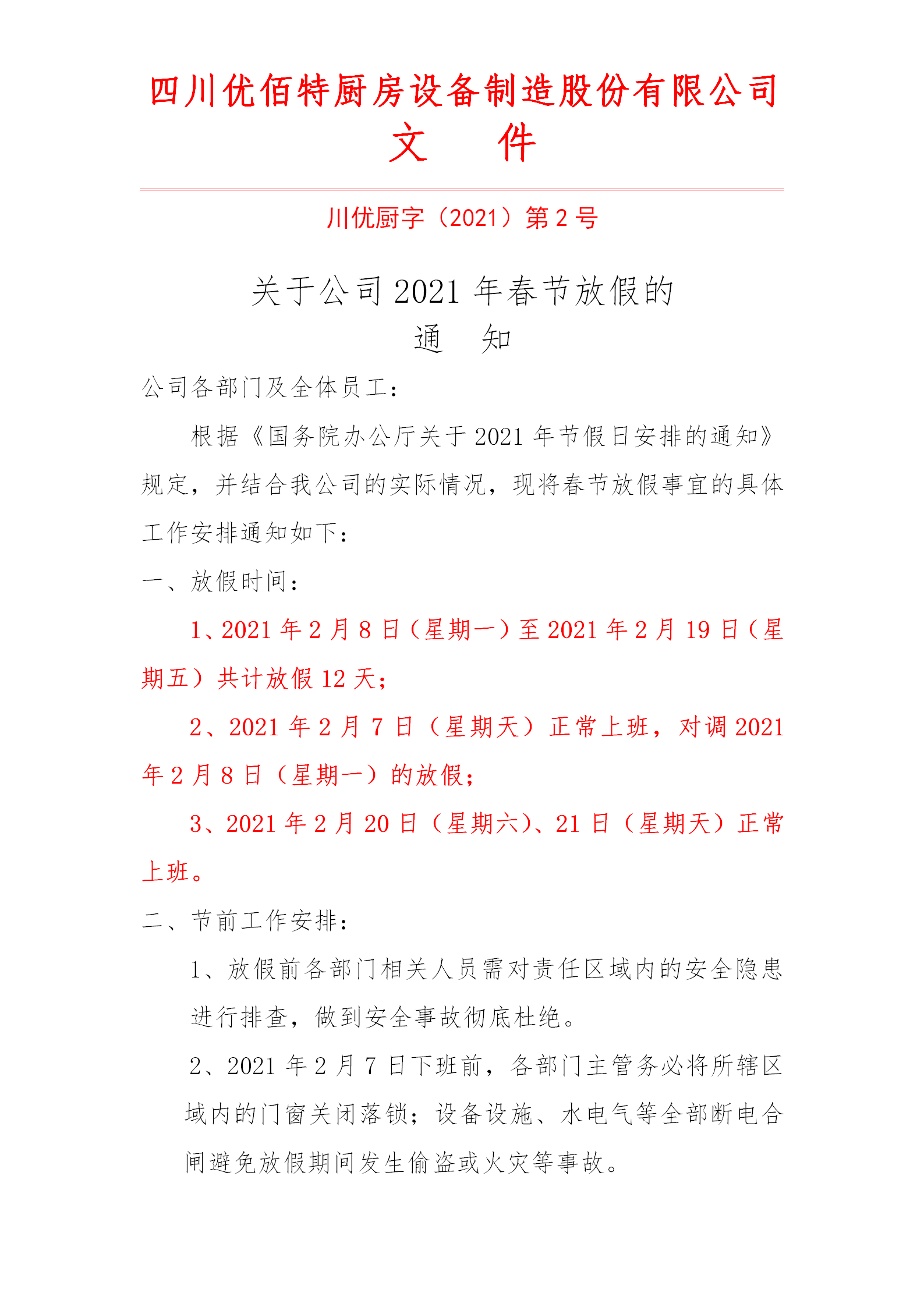 感謝你這一年來對四川優(yōu)佰特廚房設(shè)備制造股份有限公司的支持,春節(jié)假期將至,優(yōu)佰特公司祝你和你的家人新春快樂,財(cái)源廣進(jìn),萬事如意。我公司根據(jù)《國務(wù)院辦公廳關(guān)于2021年節(jié)假日安排通知》,并結(jié)合我公司實(shí)際情況,對春節(jié)放假做出如下安排: