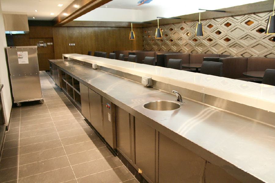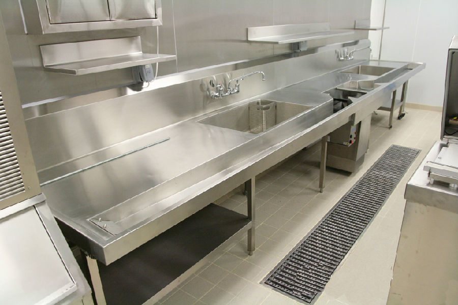 依然是一流的現(xiàn)場無縫焊接工藝,臺面非常平整,對土建(地臺施工),現(xiàn)場焊接工藝,調(diào)理臺的制造工藝要求非常高。工作臺的背板用大弧度L型設(shè)計,避免藏污納垢,容易清洗。