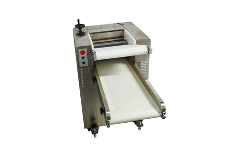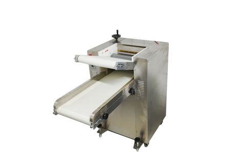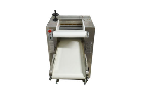 1.將定量面團放在下輸送帶上,開動機器,自動輸送到軋輥間,面團在輸送帶和軋輥作用下自動完成喂入和壓面過程。